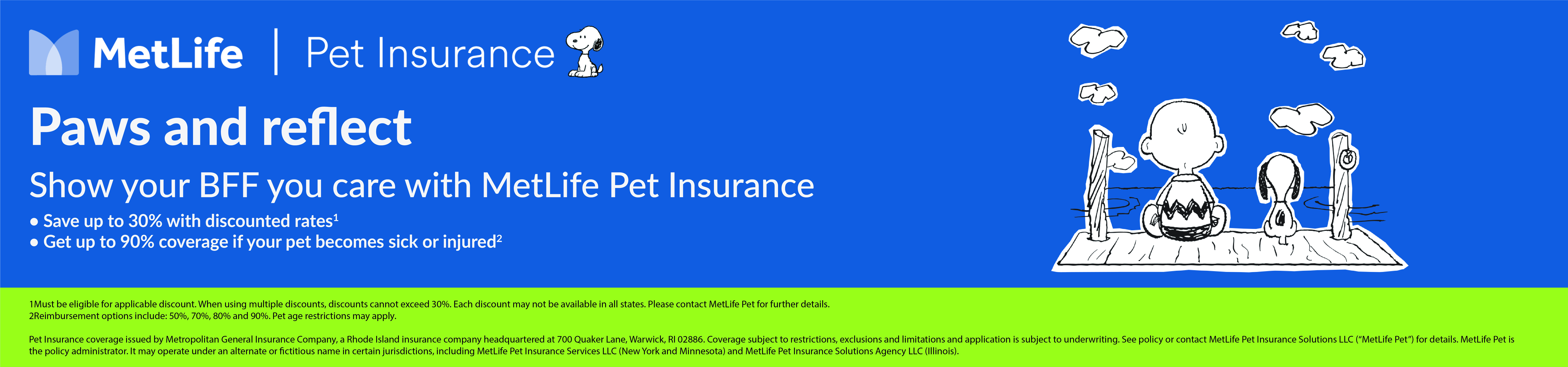Coverage issued by Metropolitan General Insurance Company (โMetGenโ), a Rhode Island insurance company, headquartered at 700 Quaker Lane, Warwick, RI 02886, and Independence American Insurance Company (โIAICโ), a Delaware insurance company, headquartered at 11333 N Scottsdale Rd, Ste 160, Scottsdale, AZ 85454. Coverage subject to restrictions, exclusions and limitations and application is subject to underwriting review. See policy or contact MetLife Pet Insurance Solutions LLC (โMetLife Petโ) for complete details. MetLife Pet is the policy administrator. The entity may operate under an alternate, assumed, or fictitious name in certain jurisdictions, including MetLife Pet Insurance Services LLC (New York and Minnesota) and MetLife Pet Insurance Solutions Agency LLC (Illinois). L0923034830[exp0925][All States][DC,GU,MP,PR,VI] ยฉ 2023 MetLife Services and Solutions, LLC, New York, NY 10166 โ All Rights Reserved. ยฉ 2023 Peanuts Worldwide LLC